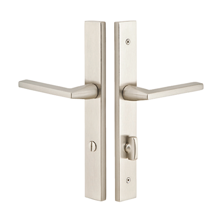 The Modern Rectangular 1½” x 11″ Thumbturn Privacy Set with Helios Levers in Satin Nickel embodies modern sophistication and precision engineering. This elegant set features a long, narrow rectangular backplate paired with the minimalist Helios lever, offering a seamless blend of function and form. Its thumbturn privacy feature ensures ease of use while maintaining a clean architectural aesthetic, ideal for contemporary interiors.